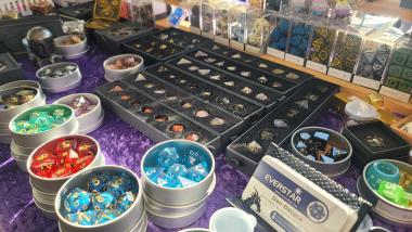 You may not need more dice, but you definately need DIFFERENT dice! Stone, Bone, Glass, Resin, Acrylic, Solid Metal, Hollow Metal, Liquid Core, Inclusions, Pride Dice, Large (55mm), Micro (6mm), somethng for everyone. We also have Gsming themed Jewelry, Wood Weapons, Foam Weapons, Hand Carved Wands, Fantasy Ears, and Dragon Statues. FREE Dice set with $40 purchase and FREE Candy for all!