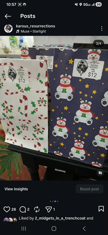 Karou's Resurrections specializes in bringing the best oddities themed mystery bags to any and every event. Multiple price points from $10-100 filled with all things macabre. Guaranteed to knock your stockings off!