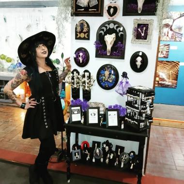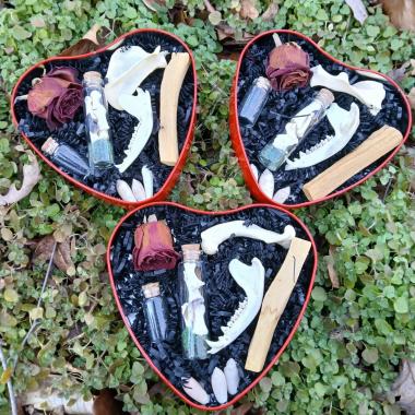 We also make other "to-go" items such as Tarot bags, all-in-1 spells in a bag and a limited selection of framed bone pieces. These darkly enchanting pieces feature all natural materials like bone, gemstones, leather and silk.
